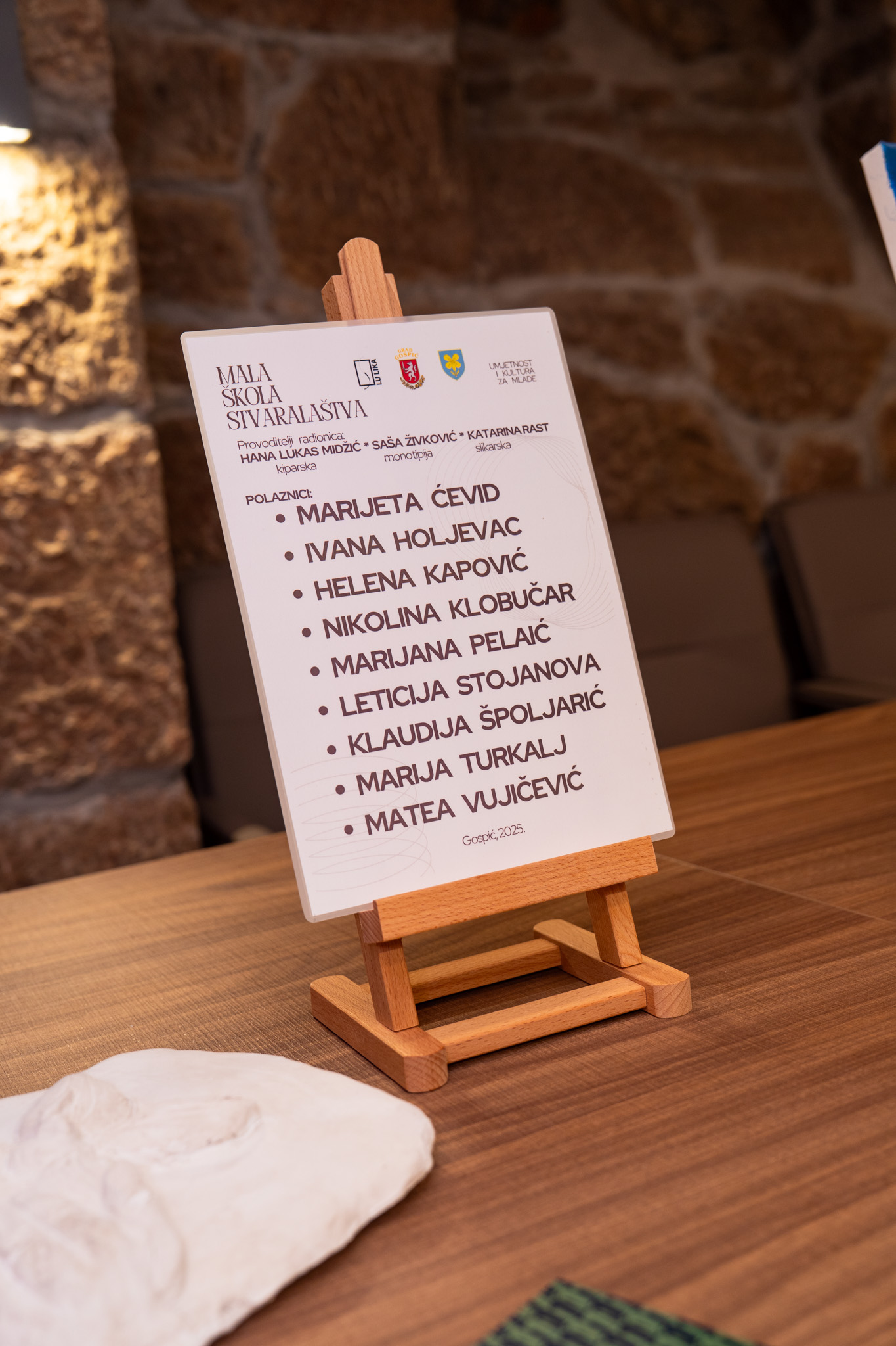 Mala škola stvaralaštva je intenzivni tromjesečni program likovnih radionica, namijenjen mladima od 15 do 25 godina, koji nudi jedinstvenu priliku za stjecanje praktičnih vještina i izražavanje kreativnosti kroz tri različite likovne tehnike. Program je u potpunosti besplatan za polaznike, zahvaljujući financiranju Grada Gospića, program "Umjetnost i kultura za mlade".